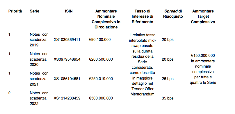 A fini di chiarezza, la società si riserva dunque il diritto di accettare più o meno (senza che rilevi quanto più o quanto meno), ovvero nessuna delle Notes di una qualsiasi serie rispetto alle Notes delle restanti serie oggetto delle offerte. La comunicazione di un’indicazione non vincolante degli ammontari accettati delle serie è prevista alle, o intorno alle, 10 (ora dell’Europa Centrale) del 31 ottobre 2016, nonostante la società possa, a sua totale discrezione, comunicare in qualsiasi momento precedente un’indicazione non vincolante dell’ammontare accettato delle serie.