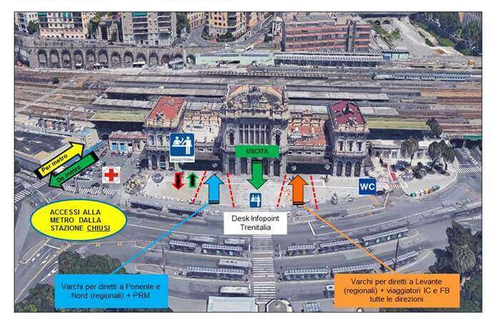 Dalle 18 di sabato nella stazione di Genova Brignole gli ingressi e i binari saranno differenziati in base alle direzioni di partenza. L’accesso alla metropolitana potrà avvenire solo esternamente al fabbricato (vedi immagine sotto).