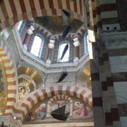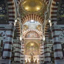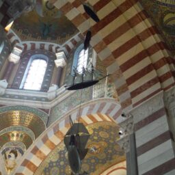 La statua della Madonna, le braccia aperte a proteggere marinai e pescatori (e non solo) che si preparano ad affrontare il Maestrale nelle acque del golfo, svetta in cima a Notre Dame de la Garde, l’edificio più imponente del forte della Garde, costruito da Francesco I nel 1524. Non è un caso che l’interno della basilica siano raccolti moltissimi ex voto di miracolati di disastri navali e aerei: dalle arcate interne e dalle colonne pendono modellini di barche e aeroplani, a simboleggiare proprio la protezione ricevuta. I richiami al mare sono quasi ovunque, a partire dalle acquasantiere a forma di prua di barca. All’esterno, la vista sulla città è a 360 gradi e spazia fino all’arcipelago del Frioul.