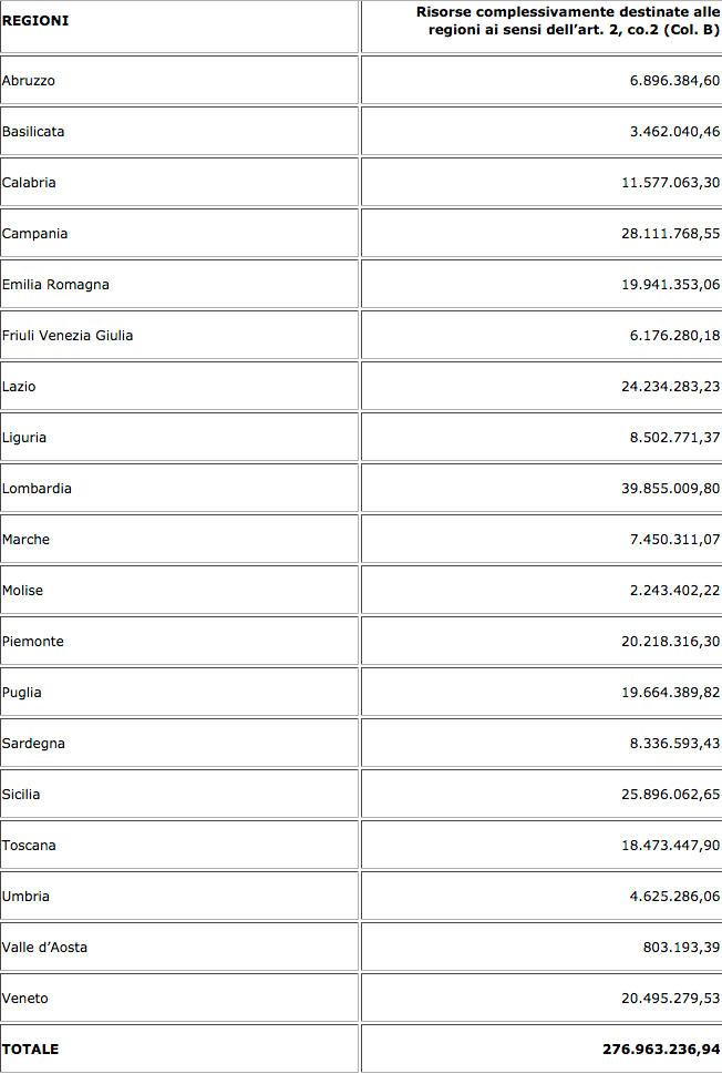 La Liguria ne riceverà 8,5 milioni, il 3,06% del totale.