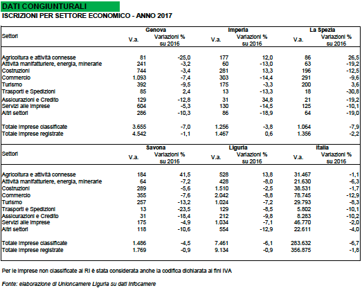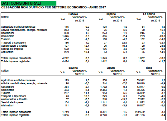 Mille le cessazioni in meno rispetto all’anno scorso, in totale un +169 (9.134 iscrizioni e 8.965 cessazioni). Andando a vedere i dati passati emerge però un numero inferiore in termini di quantità: nel 2010 erano state 11.166 le iscrizioni e 10.631 le cessazioni. L’annus horribilis fu il 2013 con 10.047 iscrizioni e 12.369 cessazioni. L’anno scorso furono 9.220 le iscrizioni e 9.946 le cessazioni. Lo stock delle imprese è leggermente aumentato (+0,1%), in Liguria sono 162.949 (tasso di crescita dello 0,22%, in aumento rispetto allo 0,17% del 2016).
