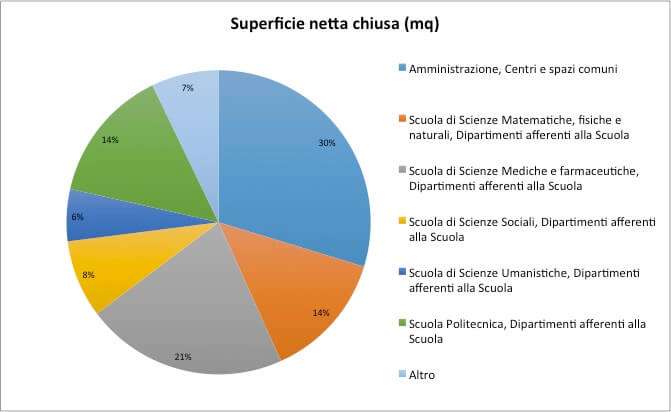In totale sono 386.741 i metri quadrati di superficie netta chiusa a disposizione dell’Università tra le cinque Scuole, l’amministrazione, i centri e gli spazi comuni e altri edifici. Nel grafico la suddivisione percentuale di questi spazi