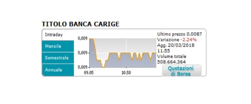 Questa mattina alle 11.55 le azioni dell’istituto di credito genovese segnavano un ribasso del 2,24% a 0,0087 euro con un volume di 508.664.364 di pezzi scambiati. Il valore dei pezzi passati di mano sfiora l’1% del valore totale, una cifra che può essere determinata da normali scambi dovuti essenzialmente a prese di beneficio dopo i rialzi della settimana scorsa ma anche a manovre, tenuto conto del fatto che l’andamento di questa mattina segue il calo del 6,3% registrato ieri 19 marzo con volumi che hanno raggiunto i tre miliardi di titoli, corrispondenti al 5% del capitale.