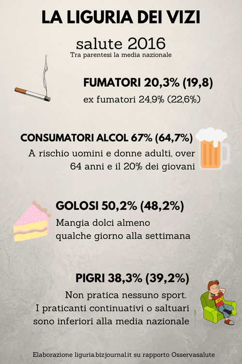Come stanno i liguri? A giudicare dalle abitudini che contribuiscono all’insorgere di patologie con il passare dell’età, non c’è da stare tanto tranquilli. Si sa che prevenire è meglio che curare e i dati contenuti nel rapporto Osservasalute 2017, a cura dell’Università cattolica del Sacro Cuore, che ogni anno fotografa lo stato di salute e la qualità dell’assistenza nelle regioni italiane, sono allarmanti.