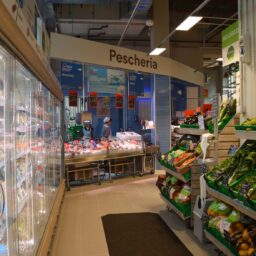 Al piano terra si trovano la piazza dell’ortofrutta, con un’area dedicata a quella locale, il banco assistito della pescheria, salumi, formaggi e prodotti di gastronomia a libero servizio. E ancora, i prodotti tipici del territorio, vini, birre, surgelati e la barriera casse, composta da tre postazioni.