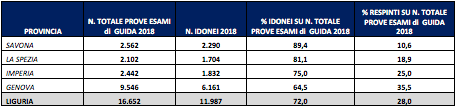 Tra le province, al primo posto per numerosità c’è Genova con 6.161 persone idonee all’esame di guida, seguita da Savona con 2.290, Imperia con 1.832 e La Spezia con 1.704. Ma se si considera la percentuale di promossi, la provincia più “virtuosa” è Savona (89,4%). Seguono La Spezia (81,1%), Imperia (75%) e, all’ultimo posto, Genova (64,5%).