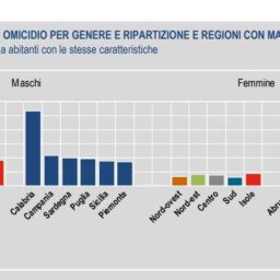 Calabria con 2,68 omicidi per 100 mila maschi, valore 2,5 volte più elevato rispetto alla regione che la segue in graduatoria, la Campania (1,07).
