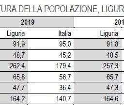 Nel 2019 il Comune più giovane della regione è Ortovero (Savona), con un’età media di 43,3 anni, mentre il più vecchio è Fascia (Genova), dove l’età media è di 66,1 anni, la più alta d’Italia