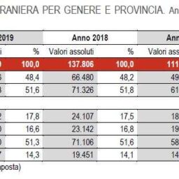 Le province di Genova e La Spezia mostrano valori del tasso di occupazione superiori alla media regionale, sia per la componente maschile sia per quella femminile. La Spezia ha la percentuale di occupazione maschile più elevata (55,4%), Genova quella femminile (39,1%). La provincia di Imperia, registrando il decremento maggiore nel numero degli occupati (-4,8%), si conferma anche nel 2019 l’area a minor incidenza di occupati, sia tra gli uomini (49,9%) che tra le donne (35,9%). Anche per le persone in cerca di occupazione l’area di Imperia registra l’incidenza maggiore (13%); all’opposto, Genova presenta il tasso di disoccupazione più basso (9,6%).