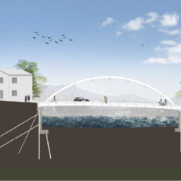 ll nuovo attraversamento è immediatamente a valle dell’esistente ponte crollato e con asse lievemente ruotato in senso orario in modo da risultare il più possibile ortogonale alla direzione della corrente e ottimizzare l’interferenza con i raccordi stradali di imbocco e di uscita nonché la luce complessiva da superare. Il ponte (campata unica 57 metri, in precedenza c’erano pile in alveo) avrà una struttura portante in acciaio e opere accessorie in calcestruzzo armato e sono previste opere idrauliche di raccordo alle difese spondali esistenti.