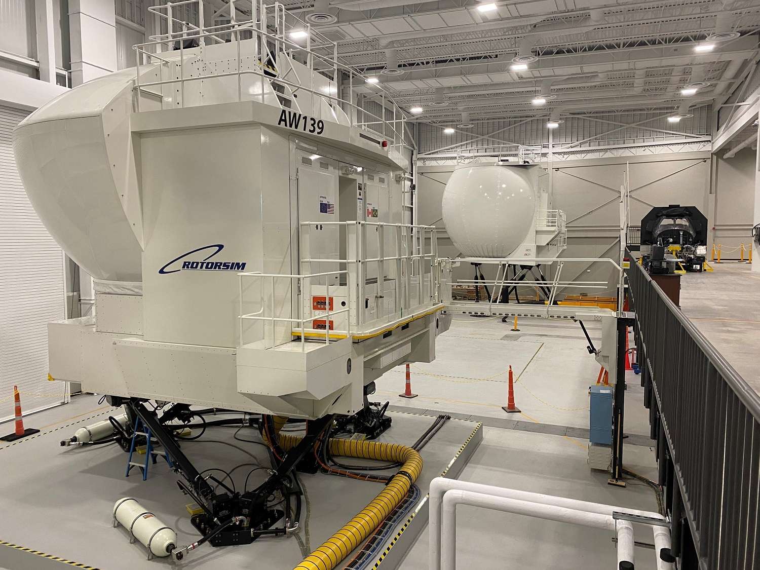 Inoltre, presenti anche due simulatori di volo ‘full motion’: uno per l’AW139 e uno per AW169 / AW609 con funzionalità roll-on / roll-off. Quest’ultima consente cioè di installare alternativamente entrambi i cockpit sulla medesima piattaforma mobile. Sviluppati congiuntamente da Leonardo e dall’azienda canadese CAE e gestiti tramite la loro joint venture Rotorsim, i simulatori forniscono una formazione realistica per missioni specifiche, tra cui offshore, sicurezza e servizi di pubblica utilità, elisoccorso e trasporto passeggeri. Il simulatore di volo ‘full motion’ dell’AW139 è stato trasferito a Filadelfia da Whippany (New Jersey) mentre quello dell’AW169 è uno degli unici due simulatori di questo modello attualmente operativi al mondo in grado di replicare alla perfezione in ambiente virtuale il prodotto reale, avvalendosi dei dati originati da Leonardo in quanto proprietario e costruttore degli elicotteri. Inoltre, esiste già uno spazio che potrà consentire l’aggiunta in futuro di un terzo simulatore di volo completo, in base alla richiesta del mercato.