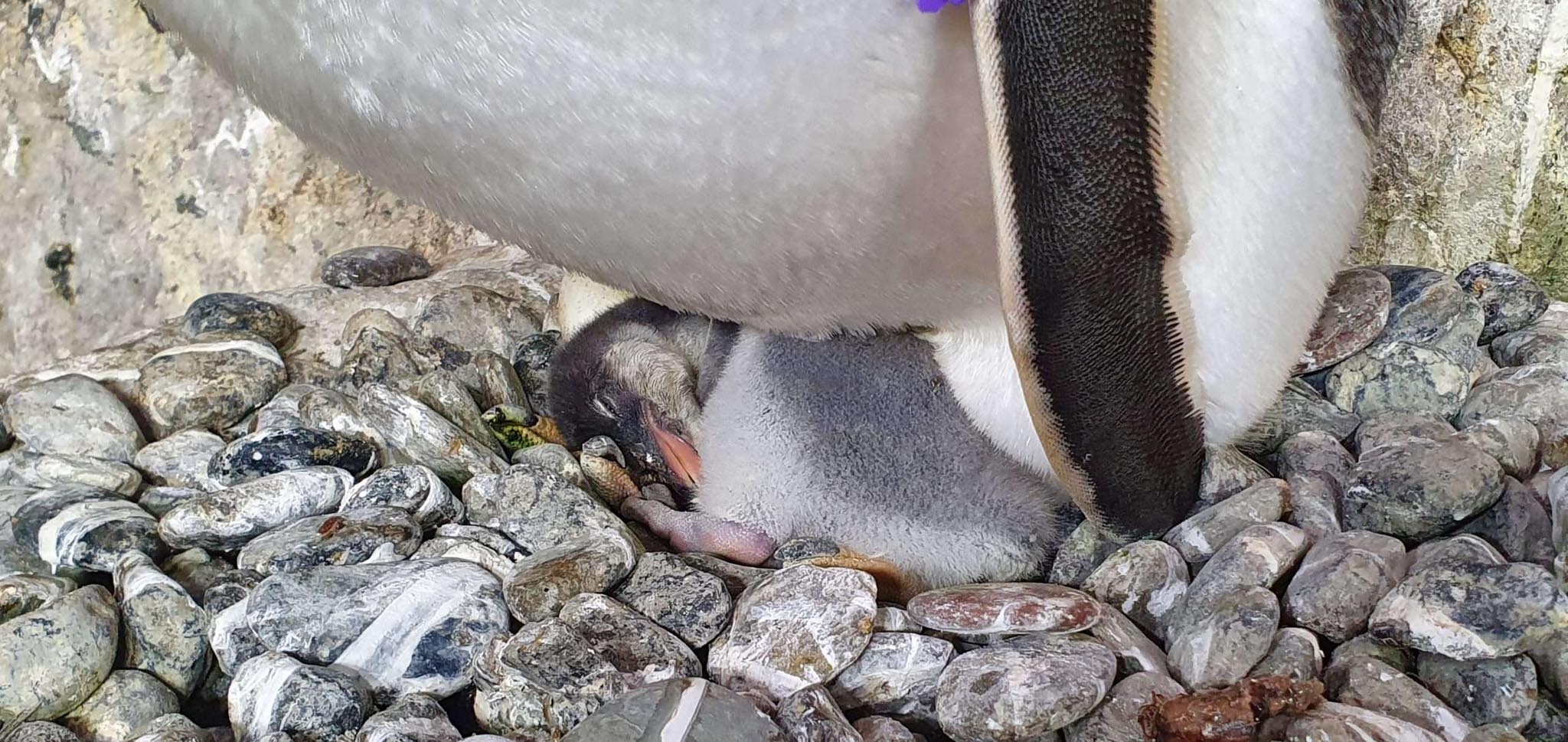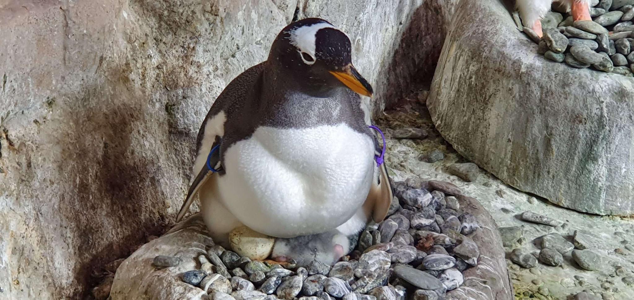 Il piccolo è nato il 2 luglio da un uovo deposto il 24 maggio nel nido di ciottoli fatto da papà Kowalski e mamma Rosi, nata nel 2006. L’uovo è stato covato alternativamente dai genitori che provvedono ora a nutrire il piccolo rigurgitando direttamente nel suo becco alimenti pre-digeriti. Kowalski, alla sua prima esperienza da genitore, e la mamma non abbandonano mai il nido contemporaneamente e sono molto attenti a proteggere il pulcino.