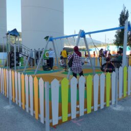 L’area giochi per bambini è totalmente pavimentata con gomma antitrauma drenante e recintata sui 4 lati: è completamente priva di barriere architettoniche.