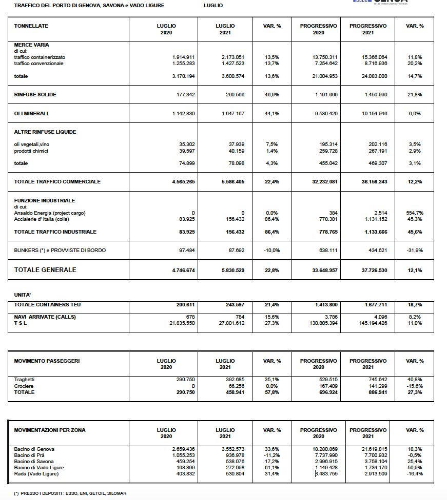 Il traffico commerciale nei porti di Genova e Savona-Vado nel mese di luglio 2021 ha fatto registrare una movimentazione complessiva pari a 5.586.405 tonnellate, pari a +22,4% rispetto allo stesso mese del 2020.