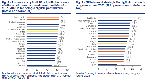 La Liguria è indietro sulla digitalizzazione, lo dimostrano sia i dati del censimento permanente delle imprese al 2018, sia una survey interna di Intesa Sanpaolo tra giugno e luglio 2021. Come dimostrano i grafici qui sotto, la Liguria è quint’ultima tra le imprese con più di 10 addetti che hanno effettuato almeno un investimento nel triennio 2016-2018 in tecnologie digitali per territorio e ultima per percentuale di imprese che intendono attuare interventi strategici in digitalizzazione in programma nel 2021.