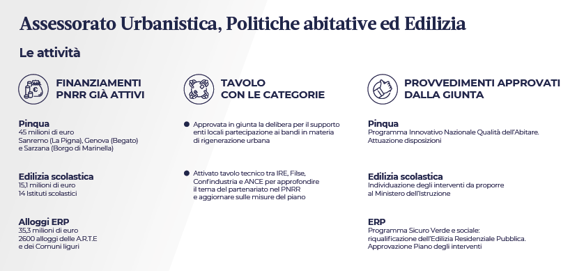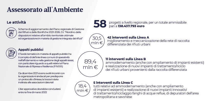 L’ambiente ha una fetta importante a livello di numero di progetti: 58, come spiega l’assessore Giacomo Giampedrone: «Per un totale ammissibile di oltre 138 milioni di euro. Altra importante iniziativa è stata l’avvio di un tavolo tematico in materia di appalti pubblici per definire linee comuni di operatività nell’affidamento e nella gestione degli appalti stessi, un lavoro svolto insieme alle organizzazioni sindacali. Si è giunti alla stesura di una bozza di Protocollo d’intesa, che è stata inoltrata alle associazioni datoriali per una condivisione. Il documento definitivo verrà sottoscritto prima dell’avvio delle procedure concernenti gli incarichi di progettazione e conseguentemente l’affidamento dei lavori e l’acquisizione dei beni e dei servizi nell’ambito del Pnrr».