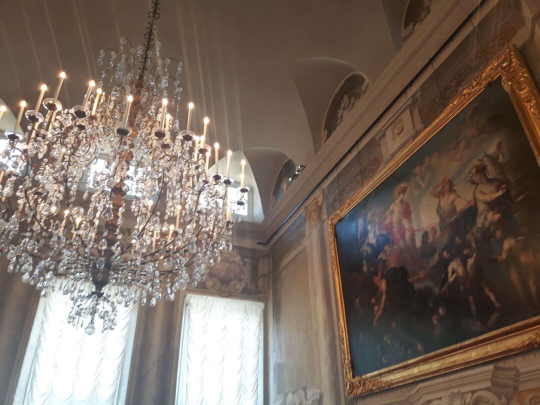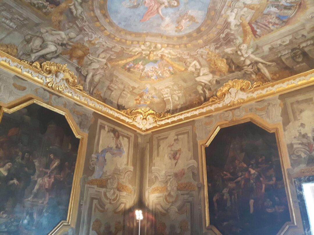 Anton Giulio II era appena rientrato da un’ambasceria a Parigi (dove si era fatto ritrarre da Hyacinthe Rigaud), e si rivolge ad artigiani francesi per almeno una parte della decorazione, di gusto orientaleggiante, della prima sala; mentre gli affreschi sono di Gregorio De Ferrari.