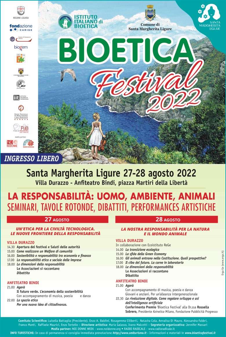 Fra tavole rotonde, dibattiti e seminari – a Villa Durazzo – e performance artistiche, all’insegna di musica, teatro e mostre fotografiche – all’anfiteatro Bindi – si terrà sabato 27 e domenica 28 agosto 2022, a Santa Margherita Ligure, la sesta edizione del Festival della Bioetica, promosso dall’Istituto Italiano di Bioetica e dal Comune di Santa Margherita Ligure.