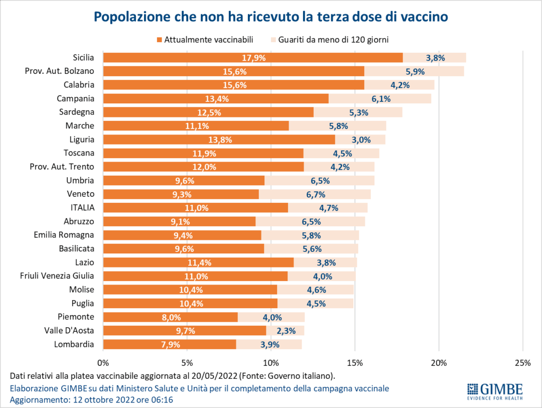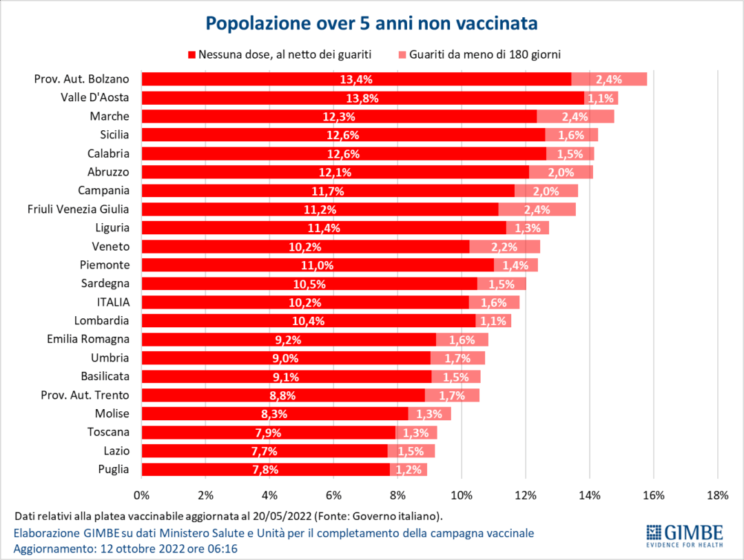 Per quanto riguarda i vaccini la Liguria il tasso di copertura di quarte dosi è salito al 21% (media italiana 18,7%). La Liguria risulta indietro nel dato relativo alla copertura vaccinale dei bambini tra i 5 e gli 11 anni (resta ferma al 27,3% contro la media nazionale al 35,2%). Ancora senza dose il 13,8% della popolazione ligure, mentre gli over 5 non vaccinati in regione sono pari all’11,4%.