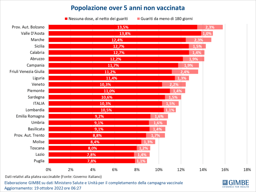 Il monitoraggio indipendente della Fondazione Gimbe rileva nella settimana 12-18 ottobre 2022, rispetto alla precedente, una diminuzione di nuovi casi, anche se gli attualmente positivi ogni 100.000 abitanti sono in aumento: 653.La Spezia (519) e Savona (503) sono tra le 31 province dove l’incidenza supera i 500 casi.