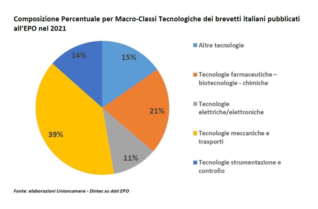L’analisi per macro–classi tecnologiche delle 4.555 domande di brevetto europeo pubblicate nel 2021 evidenzia che grazie alla crescita straordinaria del 9,5% rispetto al 2020, le tecnologie chimico-farmaceutiche che assommano 955 brevetti concentrano il 21% della capacità innovativa italiana in Europa.