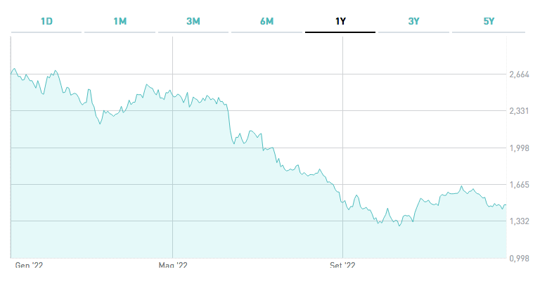 Un 2022 negativo per gli azionisti di Iren. La multiutility, quotata nel Ftse Italia Mid Cap, ha subito un lento e costante calo del valore dei suoi titoli (-45,06% in un anno), influenzati probabilmente dall’incremento dei prezzi dell’energia, tanto che il massimo annuale è stato lo scorso 4 gennaio (2,748 euro). Minimo toccato il 13 ottobre (1,265 euro).