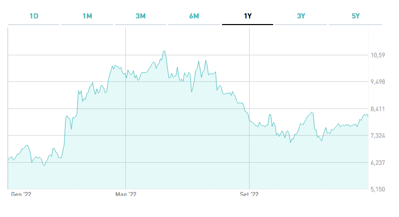 Una spinta legata alla guerra in Ucraina e un ritorno a una quotazione sottostimata rispetto a quanto sostengono gli analisti. L’anno di Leonardo è stato caratterizzato da una grande ascesa del prezzo nella parte centrale di questo 2022. L’azienda, quotata nel Ftse Mib, ha toccato l’apice l’8 giugno (10,895 euro) e il minimo il 7 febbraio (6,048 euro). Sull’anno ha comunque un guadagno del 27,89%.