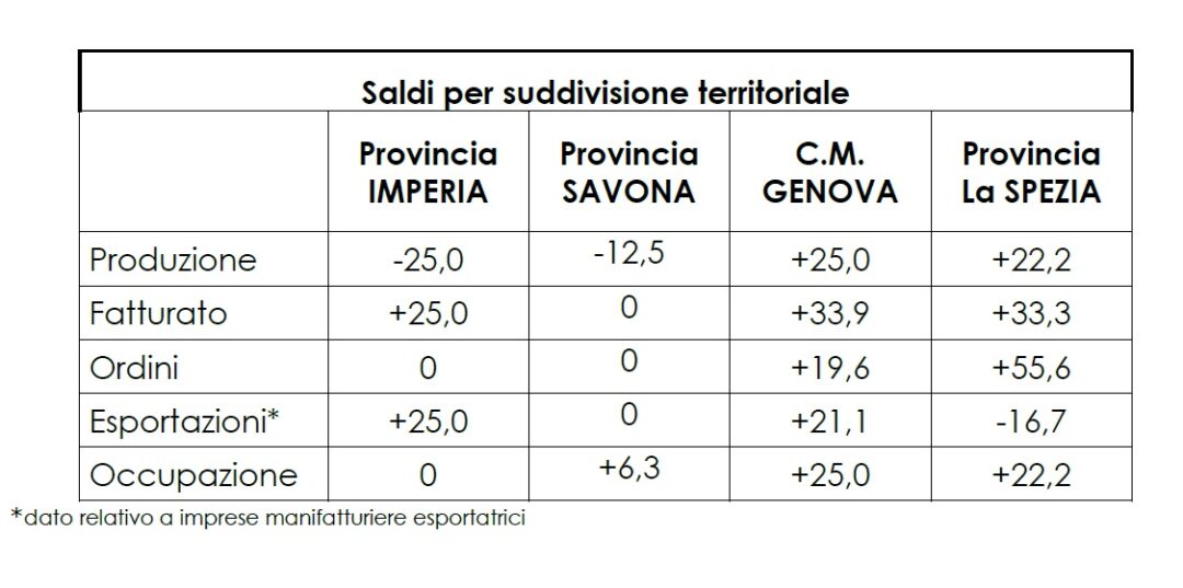Con riferimento al dettaglio territoriale, migliora il clima di fiducia tra le aziende operanti nella Città metropolitana di Genova. Rispetto alla precedente rilevazione, cresce il numero di imprenditori ottimisti su produzione, ordini e occupazione e, al contempo, diminuisce il numero di pessimisti. In miglioramento anche l’indicatore riguardante le esportazioni. Diminuisce la percentuale di aziende del campione che prevede investimenti per ampliamento o sostituzione della capacità produttiva.