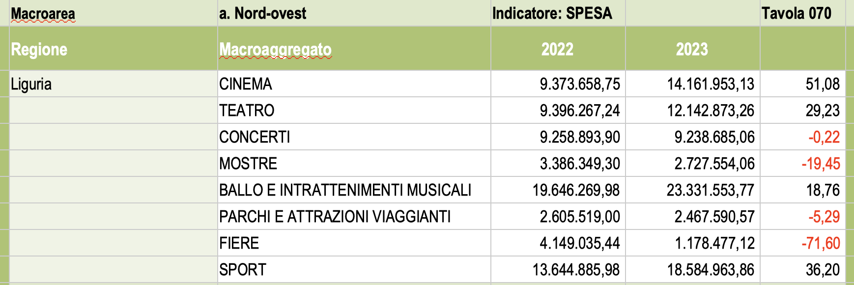 In ambito musicale (Pop Rock e Leggera) la Liguria ha visto un incremento più marcato degli spettacoli (+28%).
