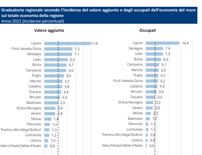 La Liguria occupa una posizione di primo piano in Italia nell’economia del mare. È quanto risulta dal XII Rapporto Nazionale sull’Economia del Mare 2024 a cura di Osservatorio Nazionale sull’Economia del Mare Ossermare e Centro Studi Tagliacarne, Unioncamere. La Liguria, per incidenza dell’economia blu sul sistema regionale, nel 2022 si colloca al primo posto sia in termini di ricchezza prodotta, dove il rapporto raggiunge l’11,9%, sia per quel che concerne il numero di occupati, con una incidenza che si attesta al 14,4%. In entrambi i casi l’incidenza registrata dalla Liguria è pari a quasi il doppio della quota della regione che si colloca al secondo posto. Si tratta del Friuli-Venezia Giulia per quanto riguarda la classifica del valore aggiunto prodotto (dove l’economia del mare genera il 7,2% della ricchezza complessiva del territorio) e della Sardegna per quanto riguarda gli occupati.