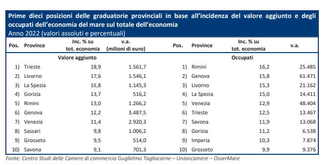 Se esaminiamo le prime dieci posizioni delle graduatorie provinciali in base all’incidenza del valore aggiunto e degli occupati dell’economia del mare sul totale dell’economia, per valore aggiunto risultano La Spezia al terzo posto, Genova al sesto e Savona al decimo, per numero degli occupati Genova al secondo posto, La Spezia al quarto, Savona al settimo, Imperia al nono.