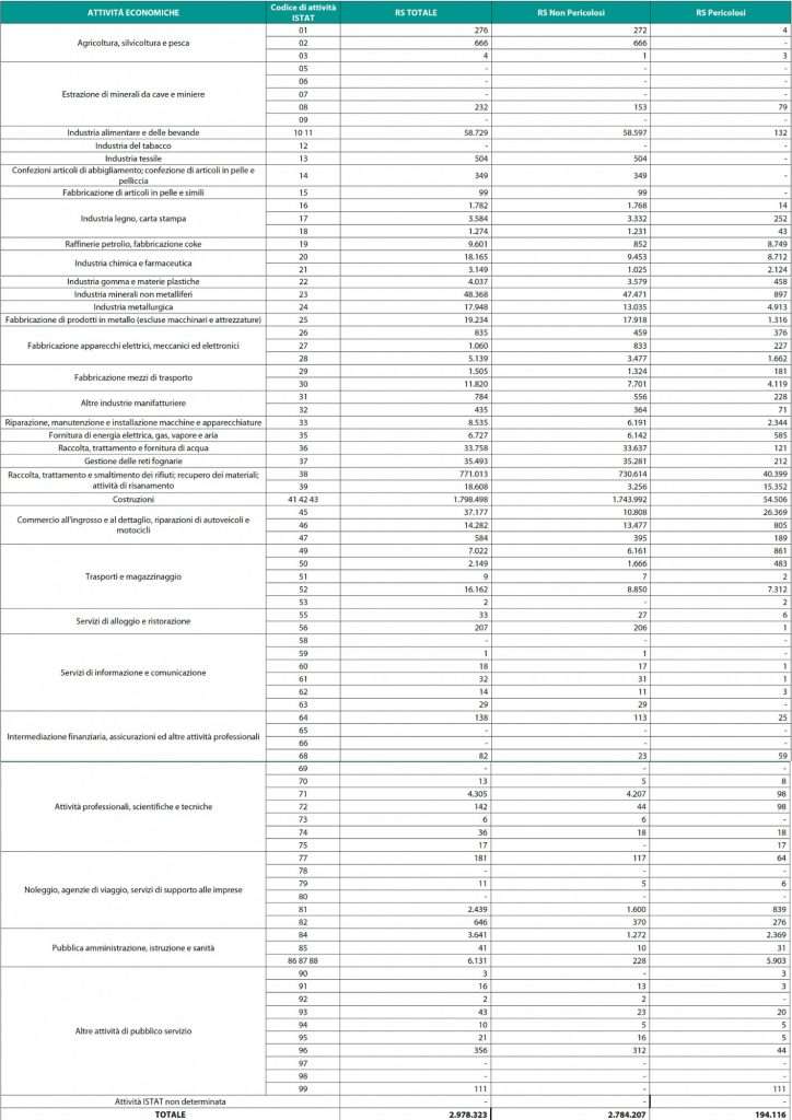I rifiuti non pericolosi in Italia rappresentano il 93,8% del totale dei rifiuti prodotti e presentano un calo di 2,7 milioni di tonnellate (-1,8%), quelli pericolosi di quasi 680 mila tonnellate (-6,4%).