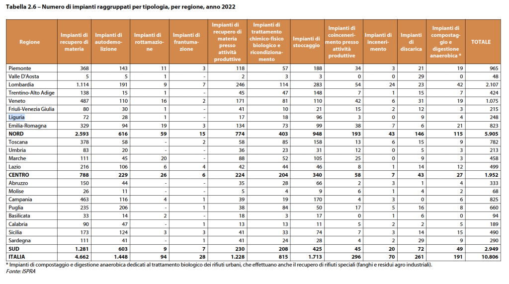 In Liguria sono 248 gli impianti dedicati alla gestione dei rifiuti speciali. Mancano impianti di frantumazione e incenerimento, rispetto ad altre regioni.