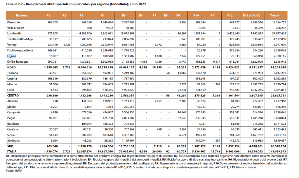 Come viene suddiviso il recupero dei rifiuti speciai non pericolosi si può vedere nella tabella successiva. In Liguria prevale il riciclo/recupero di altre sostanze inorganiche.