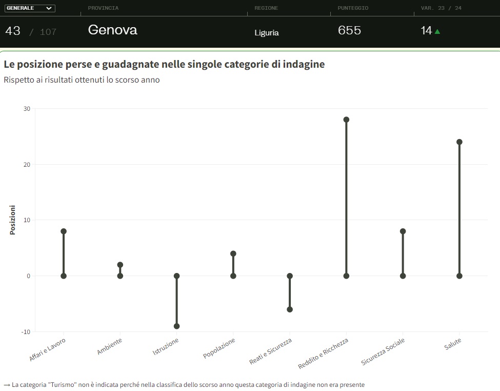Ultima, nella stessa categoria, Imperia che ottiene un punteggio pari a 429 e si colloca in 73° posizione (nel 2023 era 69°).