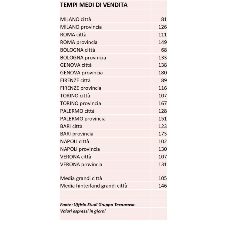 I tempi di vendita più brevi si segnalano nell’hinterland di Firenze (116 giorni), che migliora di 6 giorni grazie soprattutto al traino del mercato della casa vacanza. Seguono l’hinterland di Milano con 126 giorni, sostanzialmente invariato rispetto a un anno fa (127 giorni).