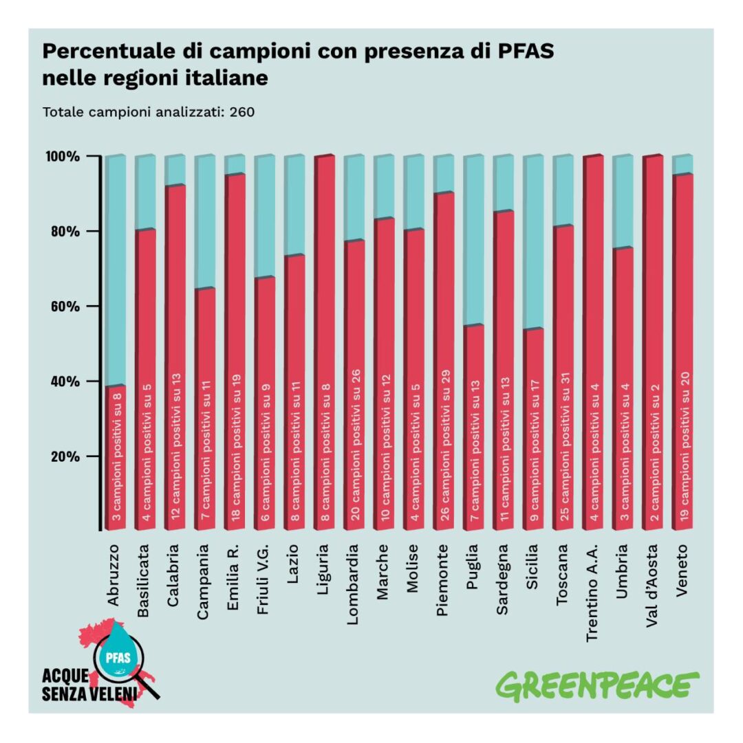 L’analisi dei 260 campioni dimostra una diffusa presenza di questi composti pericolosi, con almeno tre campioni positivi per ogni Regione, eccezion fatta per la Valle d’Aosta in cui sono stati prelevati solo due campioni. Livelli elevati si registrano in Lombardia (ad esempio in quasi tutti i campioni prelevati a Milano) e in numerosi comuni del Piemonte (Torino, Novara, alcuni comuni dell’alessandrino, ma anche Bussoleno in Valle di Susa), del Veneto (anche in comuni fuori dall’area rossa già nota per essere tra le più contaminate d’Europa, come Arzignano, Vicenza, Padova e Rovigo), dell’Emilia-Romagna (Ferrara, Comacchio, Reggio Emilia), della Liguria (Genova, Rapallo, Imperia), della Toscana (Arezzo, Lucca, Prato), della Sardegna (Olbia, Sassari e Cagliari) e Perugia in Umbria.