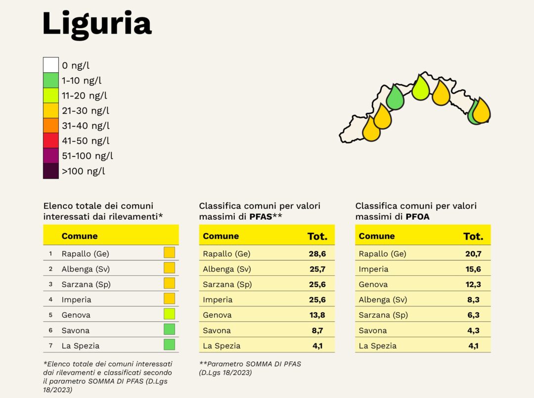 La Liguria è la regione con la contaminazione più diffusa da Pfas, composti poli e perfluoroalchilici, nelle acque potabili. A dirlo è l’indagine “Acque Senza Veleni” di Greenpeace che a settembre e ottobre 2024 ha raccolto in tutta Italia 260 campioni di acqua potabile in 235 città da Nord a Sud, alla ricerca di Pfas. In Liguria sono stati raccolti e analizzati 8 campioni e tutti e 8 sono risultati contaminati. Dall’indagine, che è stata presentata oggi a Roma, emerge che i Pfas sono presenti nel 79% dei campioni di acqua potabile analizzati da Greenpeace Italia.