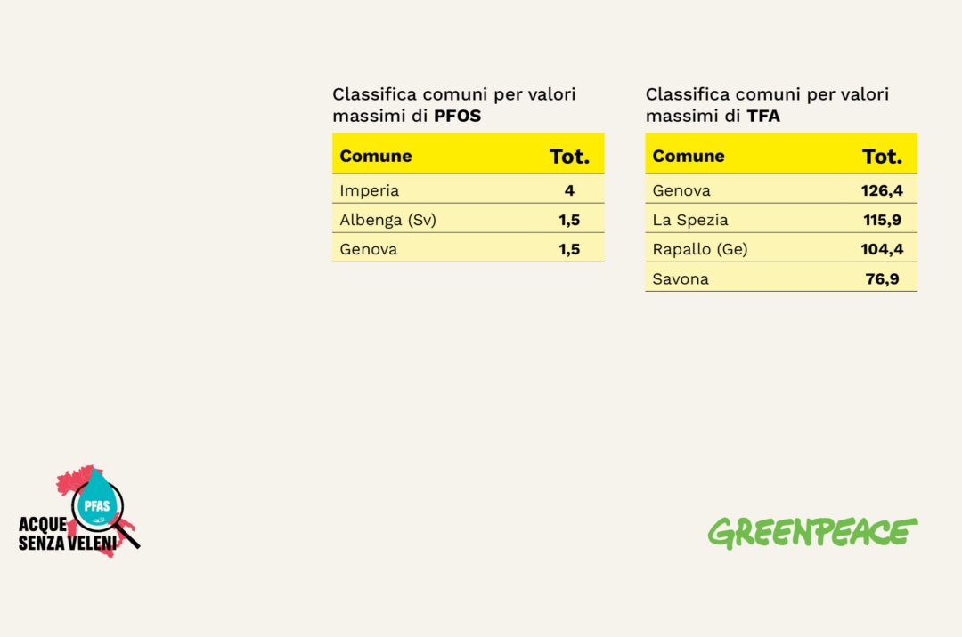 Nell’ambito delle sue analisi indipendenti, Greenpeace Italia ha inoltre verificato la presenza nelle acque potabili italiane del Tfa, la molecola del gruppo dei Pfas più diffusa sul pianeta, per cui nel nostro Paese non esistono dati pubblici. Il Tfa è una sostanza persistente e indistruttibile ancora oggetto di approfondimenti scientifici che, per le sue stesse caratteristiche, non può essere rimossa mediante i più comuni trattamenti di potabilizzazione. Il comune di Castellazzo Bormida (Al) ha mostrato i valori più elevati (539,4 nanogrammi per litro), seguito da Ferrara (375,5 nanogrammi per litro) e Novara (372,6 nanogrammi per litro). Concentrazioni molto alte si registrano anche ad Alghero (Ss), Cuneo, Sassari, Torino, Cagliari, Casale Monferrato (Al) e Nuoro. La Sardegna (77% dei campioni positivi), il Trentino Alto Adige (75% dei campioni positivi) e il Piemonte (69% dei campioni positivi) sono le Regioni in cui la contaminazione da Tfa è risultata essere più diffusa.