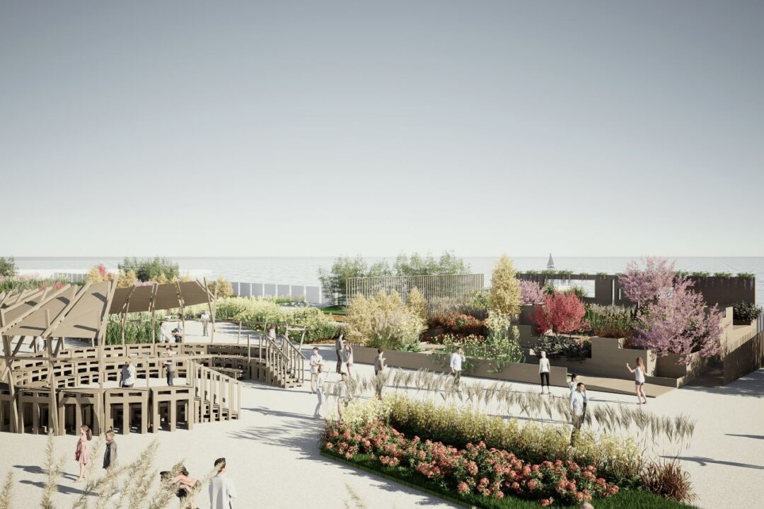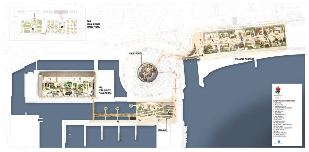 Dal parco urbano si entrerà poi nell’arena centrale del nuovo Palasport per proseguire negli spazi del piazzale Mare, attraversare una zona galleggiante in Marina e approdare infine ai due piani del padiglione Jean Nouvel.