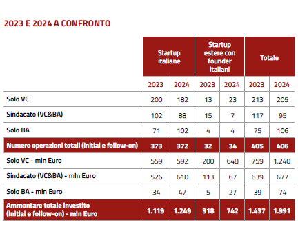Relativamente alle sole startup con sede in Italia, venture capital e corporate venture capital hanno investito 592 milioni di euro su 182 round, le attività di sindacato tra venture capital, corporate venture capital e business angel hanno fatto registrare investimenti pari a 610 milioni di euro su 88 operazioni e i soli business angel hanno investito 47 milioni in 102 round. Il totale di queste attività porta la filiera del Venture Capital in Italia ad aver investito oltre 1,2 miliardi di euro su 372 round. Aggiungendo anche gli investimenti in startup estere con founder italiani, il totale complessivo si attesta a 2 miliardi di euro su 406 round.