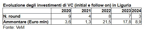 In Liguria si registra un aumento degli investimenti VC (initial e follow on) nel periodo 2020- 2024. La crescita nel quinquennio sembra indicare una tendenza di lungo periodo, il calo dal 2024 al 2023 può essere congiunturale e dipendere dagli investimenti già realizzati negli anni precedenti, quello che emerge con chiarezza è la disparità tra la Liguria, in fatto di round e investimenti, rispetto alle altre regioni del Nord. Un gap che colloca la Liguria al livello delle regioni del Sud.