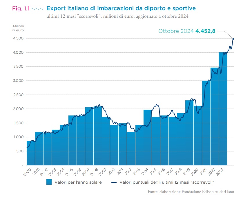 In questo contesto, l’exploit delle esportazioni globali della produzione cantieristica nautica italiana risulta certamente l’elemento più significativo della crescita degli ultimi anni: Fondazione Edison, partner scientifico della Nautica in Cifre, ha registrato a settembre 2024 un massimo storico per l’export di unità da diporto prodotte in Italia, che ha raggiunto la soglia dei 4,5 miliardi di euro. L’Italia si conferma nel 2024 primo esportatore mondiale di unità da diporto. Nel “Libro Verde made in Italy 2030” del Ministero delle Imprese e del made in Italy la Nautica è stata dunque inserita al fianco delle storiche 4A, tradizionali pilastri dell’industria italiana.
