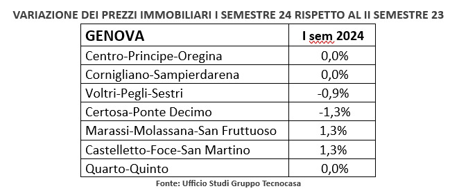 Nella prima parte del 2024 i valori immobiliari di Genova sono cresciuti dello 0,2%. A dirlo è l’ultima analisi realizzata e diffusa dall’Ufficio Studi Gruppo Tecnocasa.