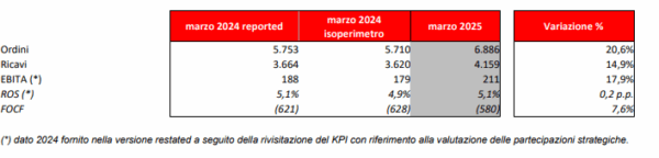 A seguito del perfezionamento dell’operazione di cessione a Fincantieri della linea di business Underwater Armaments & Systems (UAS), avvenuto in data 14 gennaio 2025, i dati del primo trimestre 2025 non includono il contributo dello stesso che, viceversa, era rilevato sino al 2024 all’interno del settore Elettronica per la Difesa e Sicurezza. Al fine di rendere maggiormente confrontabile l’andamento gestionale del Gruppo, per alcuni indicatori di performance si riporta di seguito il dato del periodo comparativo – e la relativa variazione rispetto a quello corrente – escludendo il contributo del business UAS (isoperimetro):