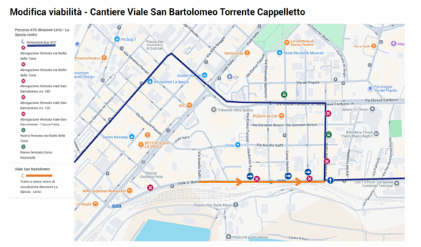 Anche il servizio di trasporto pubblico subirà variazioni. In particolare, il percorso degli autobus ATC in direzione Lerici – La Spezia centro sarà deviato. Le seguenti fermate saranno temporaneamente soppresse: via Giulio della Torre, viale San Bartolomeo civico 185, viale San Bartolomeo civico 125, viale San Bartolomeo – piazza Paila.