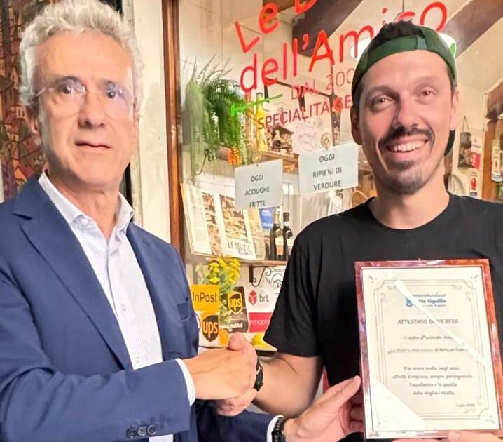 Una targa pergamena di riconoscimento a Manuel Cabras, titolare della storica sciamadda “Le Delizie dell’Amico” di vico Canneto il Lungo, nel cuore del centro storico di Genova. Questo prestigioso attestato è stato consegnato al giovane e talentuoso tortaio genovese da parte di Latte Tigullio Centro Latte Rapallo, in segno di riconoscimento per il suo attaccamento e rispetto verso la Prescinsêua, il formaggio tradizionale dei Dogi di Genova, simbolo della gastronomia ligure e genovese.