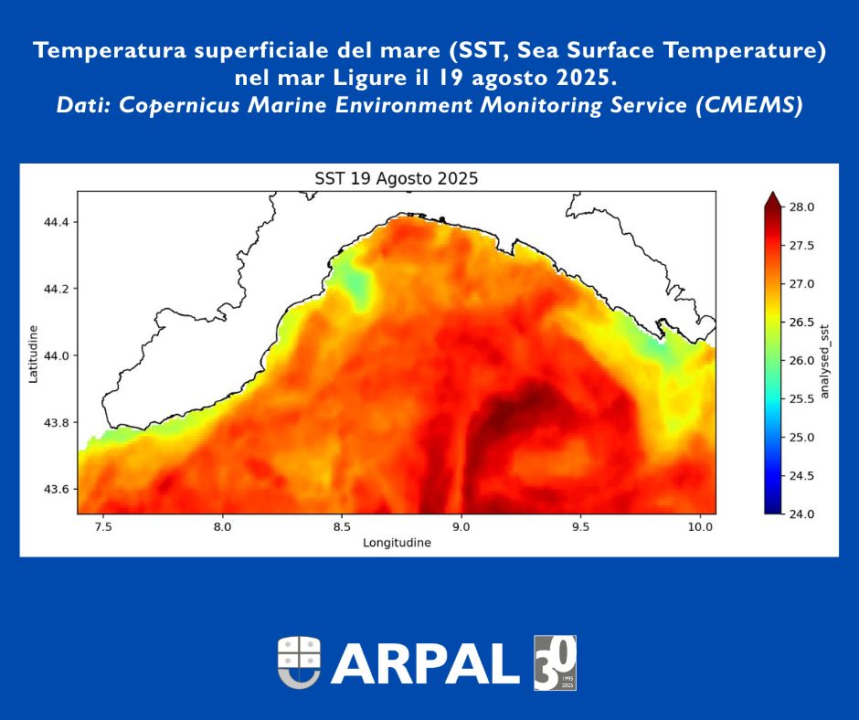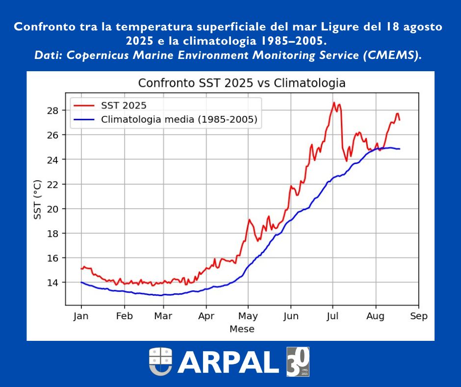 Un ulteriore elemento che potrebbe favorire l’intensificazione dei fenomeni è dato dalla temperatura del mare che, dopo la lunga ondata di calore di ferragosto, presenta un’anomalia termica media di +2C/2.5°C con alcune zone in cui i valori risultano localmente ancora più marcati: il mare si comporta infatti come un serbatoio di energia e vapor acqueo che può alimentare temporali più intensi, persistenti e distruttivi rispetto a quanto atteso in condizioni normali.