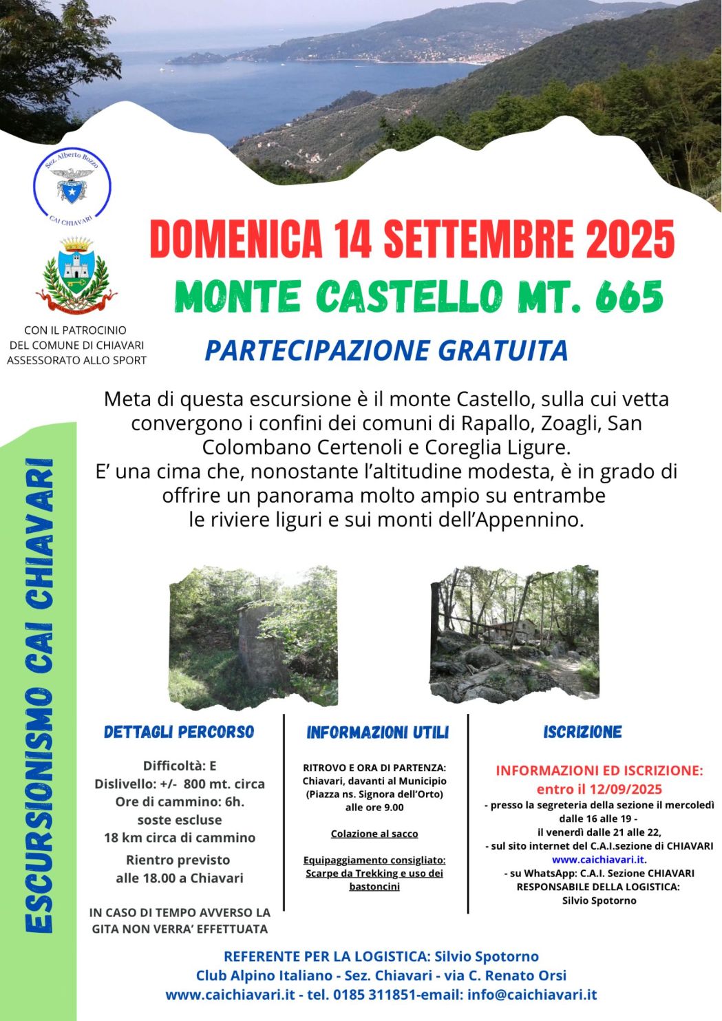 La prima meta sarà il Monte Castello (665 metri), una cima suggestiva posta al confine tra i comuni di Rapallo, Zoagli, San Colombano Certenoli e Coreglia Ligure che offre un panorama unico che su entrambe le riviere liguri e sui monti dell’Appennino.