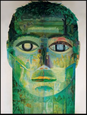 Si tratta di una sagoma di una testa gigantesca dalla quale emergono scene e oggetti evocanti i temi del lavoro, dell’innovazione tecnologica e dei cambiamenti sociali.